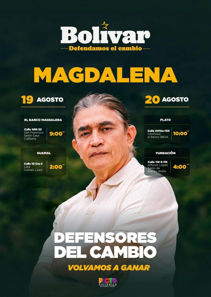 La agenda contempla actividades en El Banco, Guamal, Plato y Fundación. Tras su paso por el Magdalena, Bolívar continuará su recorrido político en Medellín, donde participará en el Congreso Nacional de Agencias de Viajes, y luego en el Cauca, donde sostendrá encuentros con comunidades afectadas por la violencia para reiterar su compromiso con la paz y la justicia social.